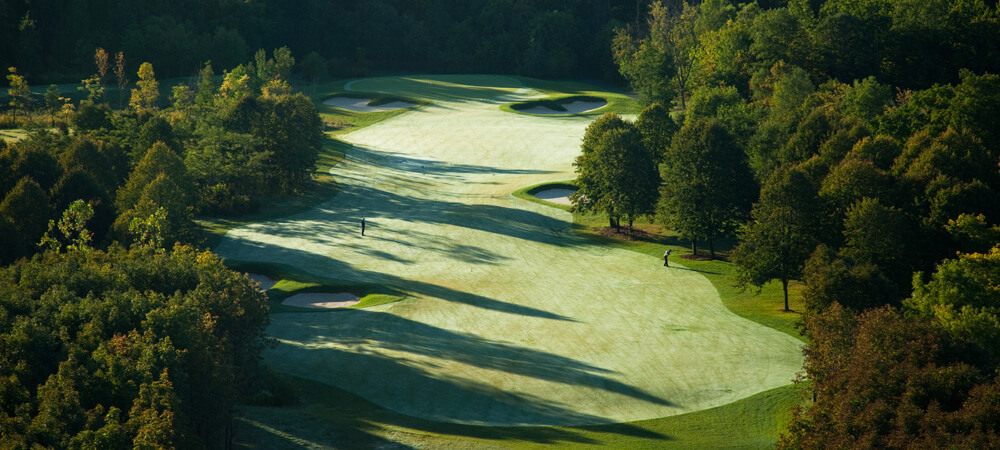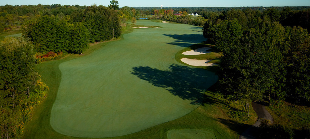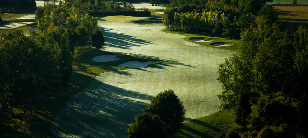At 474 yards from the tips this is a monster of a two-shot hole and as honest as they come. What you see through the narrow tree chute off the elevated tees is what you get – a straight away, stunning hole that rewards a well hit, gentle draw. For a good look at the huge green, favor the left side of the fairway tucked behind the cross bunkers. Missing right off the tee will leave you amidst towering basswood trees with no option but punching your ball back on the fairway. The green is deep and will receive low running shots, but the best play is a high fade around the right bunker short of the green. The left greenside bunker is there to save misses to the left from rolling into the wet land! A word of advice – if you don’t hit one of your best drives off the tee, treat the hole with respect, lay-up and try to make par the hard way or take a bogey as a good score.